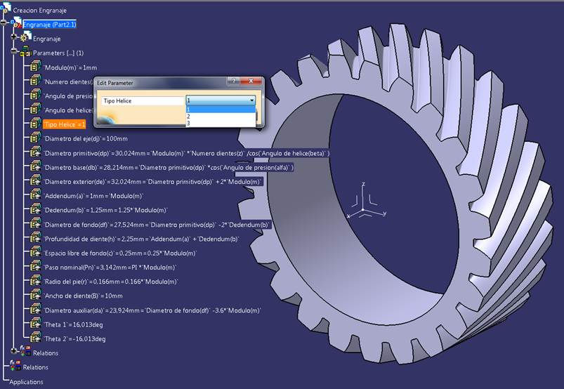 En este apartado les mostrare piezas parametrizadas. En este caso un engranaje en el que podemos cambiar su forma y tamaño, modificando el módulo, el numero de dientes y otros parametros propiamente dichos para que automaticamente el programa recalcule y construya el engranaje necesario.